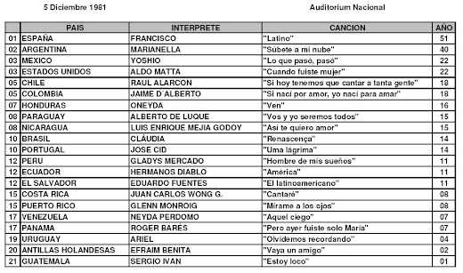 Para el palmarés final, el triunfo se lo llevó el tema español "Latino", gran éxito de Francisco creado por Herrero y Armenteros, seguido por Argentina y, en un empate por el tercer premio, las canciones mexicana y estadounidense. Estados Unidos estuvo representada por el intérprete puertorriqueño Aldo Matta, quien representara a su país de origen en el mismo certamen, ocho años después